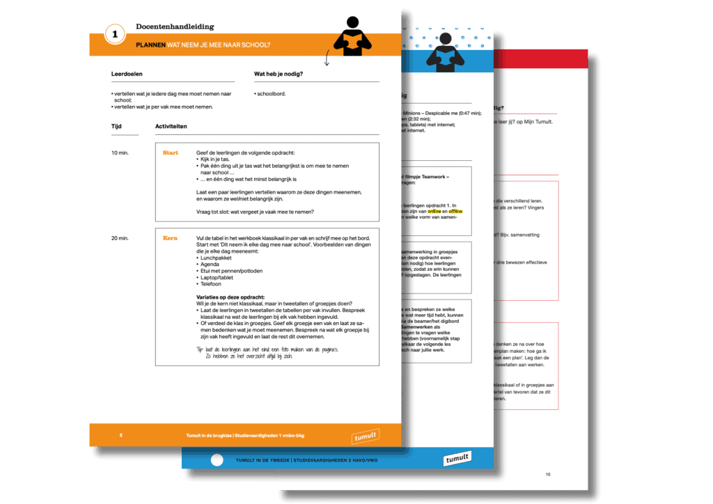 De lesvoorbereidingen zijn beschikbaar in de Tumult Member-omgeving, en als papieren docentenpakketten in de webshop.
